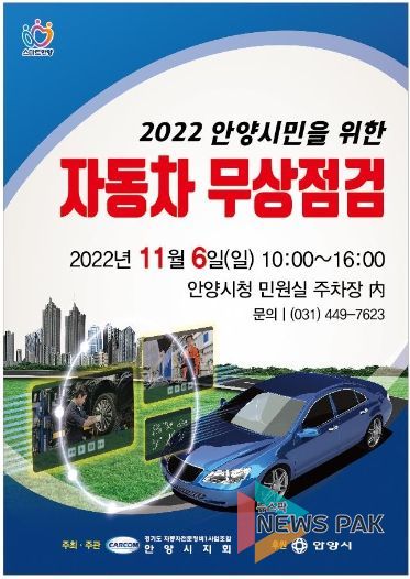 뉴스팍 최지은 기자 | 안양시는 오는 6일 오전 10시부터 오후 4시까지 안양시청 민원실 주차장에서 자동차 무상 안전점검을 실시한다고 3일 밝혔다.
