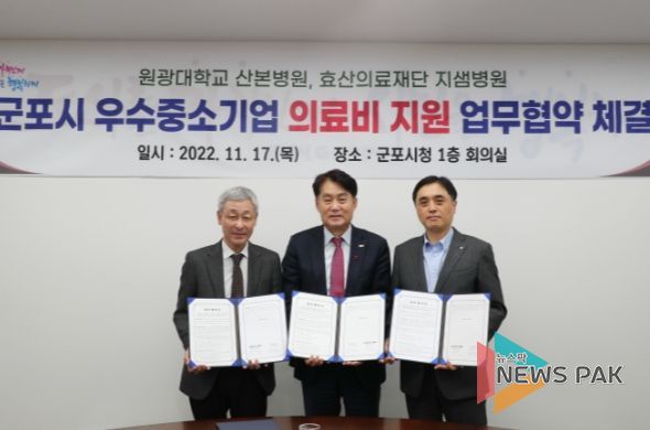 뉴스팍 최지은 기자 | 군포시는 우수중소기업으로 선정된 기업 직원들에게 의료비 우대혜택을 제공하기 위해 11월 17일 원광대학교 산본병원, 효산의료재단 지샘병원과 의료비 지원 업무협약을 체결했다.