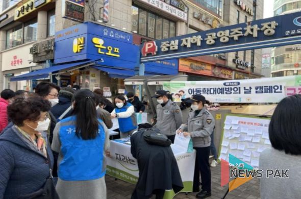 뉴스팍 최지은 기자 | 군포시아동보호전문기관은 아동학대 예방의 날을 맞이하여 18일 군포시 산본로데오거리에서 군포시청 아동학대전담공무원, 군포경찰서 학대예방경찰관(APO)과 함께 아동학대 문제에 대한 사회적 인식을 제고하고 건강하고 올바른 양육 방법을 안내하는 아동학대 예방 캠페인 ‘배우는 부모, 자라는 아이’를 진행했다.