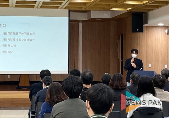 이날 교육은 ▲관내 사회적경제 조직 홍보영상 시청 ▲김정환 광명시 사회적경제과 주무관의 ‘사회적기업 제품 우선구매의 필요성 및 광명시 사례’에 대한 설명 ▲관내 사회적경제 조직의 제품 및 서비스 설명 등으로 이루어졌다.