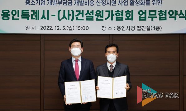뉴스팍 최지은 기자 | 용인특례시는 5일 시장 접견실에서 (사)건설원가협회와 중소기업 개발부담금 산정지원 업무협약을 체결했다고 밝혔다.