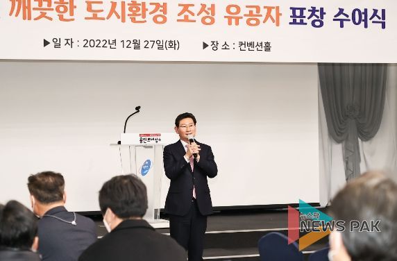 뉴스팍 최지은 기자 | 이상일 용인특례시장이 27일 올 한해 깨끗한 용인시를 만들기 위해 노력해 온 환경미화원 등 유공자 24명에게 표창을 수여하고 노고를 격려했다.