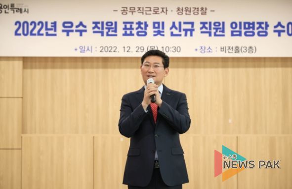 뉴스팍 최지은 기자 | 이상일 용인특례시장은 29일 공무직근로자, 청원경찰 등 우수직원 11명에게 표창을 전달하고, 신규 임용된 공무직근로자와 청원경찰 등 직원 42명에게 임명장을 수여했다.