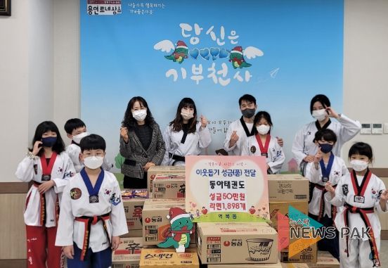 동 관계자는 “올해도 변함없이 라면과 성금을 전해주신 동아태권도 이정호 관장님과 우리 어린이들에게 고맙다”며 ”동아태권도 원생들의 따뜻하고 순수한 마음이 어려운 이웃들에게 큰 힘이 될 것“이라고 말했다.