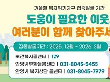 뉴스팍 배상미 기자 | 안양시는 한파와 지속된 경기 침체에 대응해 오는 3월까지 복지서비스 접근이 어려운 취약계층을 적극 발굴하고 지원하는 ‘겨울철 복지위기가구 집중 발굴 기간’을 운영한다고 6일 밝혔다. 이번 집중 발굴은 단전·단수, 실직, 휴폐업 등과 같은 위기 징후가 있는 가구, 고독사 위험이 높은 1인 가구, 저소득 장애인 가구 등이 대상이며, 위기가구를 선제적으로 찾아내고 실질적인 지원을 연계하는 데에 중점을 두고 있다. 시는 안양시무한돌봄센터, 안양시복지콜센터, 각 동 행정복지센터는 물론 명예사회복지공무원, 삼천리 등 민간 협력기관 등과 함께 위기가구를 발굴할 계획이다. 발굴된 위기가구에는 긴급복지 및 기초생활보장제도의 공적서비스를 통한 생계비 및 주거지원, 일상돌봄 지원 등의 맞춤형 복지서비스를 신속하게 제공하고 어려움이 해소될 때까지 사례관리할 계획이다. 특히, 독거노인 등 취약 어르신에게 노인맞춤형돌봄서비스를 안내 및 지원하고, 응급안전안심장비 및 고령자스마트 안심서비스 설치 등을 연계할 계획이다. 시 관계자는 “겨울철은 한파 등으로 대외 활동이 줄어들면서 고립되거나