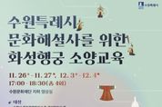 뉴스팍 배상미 기자 | 수원특례시가 문화해설사를 대상으로 화성행궁 고증 연구 결과를 교육해 ‘연구 기반 문화해설’을 정착시킨다. 수원시는 11월 26~27일, 12월 3~4일 4회에 걸쳐 수원문화재단에서 ‘수원특례시 문화해설사를 위한 화성행궁 소양교육’을 한다. 유네스코독일위원회와 유네스코한국위원회가 지원하는 이번 교육에는 수원문화재단·수원화성박물관·수원청소년청년재단 등에서 수원화성과 화성행궁을 해설하는 문화해설사들이 참여한다. 화성행궁 고증 연구의 성과를 해설 현장에 연결하기 위한 교육이다. 연구를 수행한 전문가들이 강사로 나선다. 강의 주제는 ▲화성행궁의 변화와 이중적 기능(이선희 중앙대 교수) ▲1794년 화성행궁 중심 영역의 건축적 변화(이연노 건축문헌고고스튜디오 건축구조실장) ▲화성행궁의 발굴(이승연 건축문헌고고스튜디어 건축고고실장) ▲화성행궁 생활상 고증과 공간 재현(정정남 건축문헌고고스튜디오 대표) 등이다. 수원시는 화성행궁 2단계 복원을 추진하면서 건축물 외형 복원뿐 아니라, 내부 고증에 대한 연구의 필요성을 인식하고, 2023~2024년 ‘화성행궁 생활상 고증 및 재현 방안 연구’