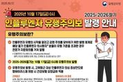 뉴스팍 배상미 기자 | 광명시는 최근 인플루엔자 환자가 빠르게 증가함에 따라 시민들에게 예방접종과 개인예방수칙 준수를 재차 당부했다. 28일 시에 따르면 올해 44주차(10월 26일~11월 1일)부터 47주차(11월 16~21일) 인플루엔자 의사환자 분율(인플루엔자 의사환자 수/총 진료 환자 수)은 외래환자 1천 명당 ▲22.8명 ▲50.7명 ▲66.3명 ▲70.9명으로 4주 연속 크게 상승했다. 올해 유행 시기가 예년보다 앞당겨지면서 지난 10월 17일 인플루엔자 유행주의보 발령 이후 감염 위험이 빠르게 높아지고 있다. 시는 특히 ▲소아 ▲임신부 ▲65세 이상 어르신 ▲면역저하자 등 고위험군은 가까운 위탁의료기관에서 신속히 접종을 받을 것을 권고했다. 또한 감염 확산을 줄이기 위해서는 손 씻기와 마스크 착용 등 기본적인 예방수칙을 지키고, 발열·기침 등 의심 증상이 있을 경우 즉시 의료기관을 방문해 진료받는 것이 바람직하다. 박선미 감염병관리과장은 “올해 인플루엔자 유행이 평년보다 빨라 주의가 더욱 필요한 시기”라며 “특히 고위험군은 서둘러 예방접종을 받고, 개인위생 수칙을 철저히