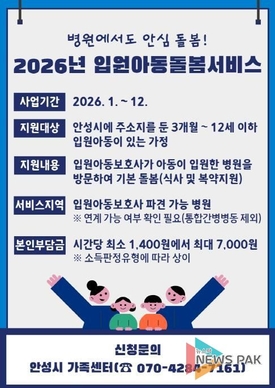 안성시, 병원에서도 안심 돌봄, 2026년 입원아동돌봄서비스 운영
