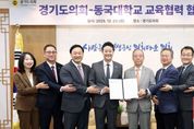 뉴스팍 배상미 기자 | 경기도의회는 23일 오전 의장 접견실에서 동국대학교와 교육협력 및 학술교류를 위한 업무협약(MOU)을 체결했다. 이날 협약식에는 김진경 의장(더민주, 시흥3)과 고준호 의원(국민의힘·파주1), 김완규 의원(국민의힘·고양12), 이병숙 의원(더민주·수원12), 박호순 의정국장이 참석했다. 동국대학교에서는 윤재웅 총장, 김용현 교무부총장, 김승용 대학원장, 유한림 BMC(바이오메디캠퍼스) 행정처장 등이 함께 자리해 협약의 의의를 더했다. 양 기관은 이번 협약을 계기로 ▲의정 발전을 위한 정보 교류 ▲전문 인재 양성을 위한 교육·연구 지원 ▲도의원 및 의회 직원 대상 대학원 장학금 지원 등 의정 활동 역량 강화를 위한 체계적인 교육 협력에 나서기로 했다. 윤재웅 총장은 “대학의 교육·연구 역량을 공유함으로써 경기도 발전에 기여할 수 있게 되어 뜻깊다”며 “경기도의회와의 지속적인 협력을 통해 실효성 있는 교육 지원을 이어갈 수 있도록 최선을 다하겠다”라고 말했다. 김진경 의장은 “의회에 대한 도민의 기대는 점점 더 복잡해지고 다양화되고 있는 만큼 의회 구성원 모두가 더