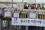 뉴스팍 배상미 기자 | 영통구 광교1동은 지난 2월 11일, 설 명절을 앞두고 관내 단체와 기관의 따뜻한 나눔이 이어지는 가운데 ‘설 명절 이웃나눔 전달식’을 개최했다고 밝혔다. 광교1동에 따르면, 이번 전달식에는 동남용역이 후원한 햄 40세트와 시립광교동어린이집에서 정성껏 준비한 생필품 꾸러미 40박스가 전달됐다. 또한 광교1동 지역사회보장협의체에서 마련한 후원금과 광교1동 공동모금회를 통해 준비된 떡국떡, 전, 나물, 과일 등 명절 음식도 함께 전달돼 뜻깊은 의미를 더했다. 특히 이번 나눔은 기업과 보육기관, 지역 복지단체가 한마음으로 참여해 설 명절을 앞두고 소외되기 쉬운 이웃들에게 따뜻한 정을 전하며 지역사회에 훈훈한 분위기를 조성했다. 광교1동은 이날 전달된 성금과 물품을 저소득 가정과 취약계층, 홀몸 어르신 등 도움이 필요한 이웃들에게 전달해 따뜻하고 풍성한 설 명절을 보낼 수 있도록 지원할 예정이다. 송숙영 광교1동장은 “설 명절을 맞아 어려운 이웃을 위해 소중한 정성을 모아주신 모든 분들께 깊은 감사의 말씀을 드린다”며, “전달받은 성금과 물품은 꼭 필요한 이웃들에게 정성껏 전달해