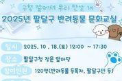 뉴스팍 배상미 기자 | 수원시 팔달구는 10월 18일 오후 12시부터 17시 30분까지 팔달구청 정문 앞마당에서 ‘2025년 팔달구 반려동물 문화교실’을 개최한다고 밝혔다. 반려동물 문화교실은 성숙한 반려문화 확산과 올바른 반려동물 관리, 양육 방법을 알리기 위해 마련됐으며 반려동물 등록자 및 팔달구민 120명을 대상으로 추진한다. 교육 프로그램은 △인식표 만들기 △산책 그룹 훈련 △반려견 셀프 미용으로 총 3개 프로그램을 추진한다. 12시부터 진행하는 ‘인식표 만들기’는 반려견 유실 방지를 위해 동물등록번호와 견주 연락처를 새긴 맞춤형 인식표를 직접 제작할 수 있고, 14시부터는 ‘산책 그룹 훈련’에서는 산책줄 핸들링과 돌발 상황 시 대처법 등 및 올바른 산책 방법에 대해 배워볼 수 있다. 15시 30분에는 초보자도 쉽게 실천할 수 있는 ‘반려견 셀프 미용 수업’이 준비되어 있다. 팔달구 관계자는 “2025년 반려동물 문화교실 개최를 통해 구민들이 반려동물을 책임감 있게 관리하고, 올바른 반려 문화가 조성되길 바란다“라고 말했다. 한편, 팔달구는 구 홈페이지, 안내문자 및 QR코드를