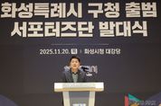 뉴스팍 배상미 기자 | 인구 100만 대도시 화성특례시가 오는 2026년 2월 1일 4개 구청(만세구·효행구·병점구·동탄구) 체제의 공식 출범을 앞두고 시민과 함께하는 본격적인 준비 태세에 돌입했다. 화성시는 20일 시청 대강당에서 ‘화성특례시 구청 출범 서포터즈단 발대식’을 개최하고, 시민 300명을 서포터즈로 공식 위촉했다. 이날 행사에는 정명근 화성시장, 배정수 화성시의회 의장, 박봉현 특례시 발전 자문위원회 고문을 비롯해 문홍승 화성세무서장, 정영한 화성우체국장, 손일만 화성동탄우체국장 등이 참석해 구청 승인의 기쁨을 나누고 성공적인 출범을 다짐했다. ◇ 15년의 도전 결실… “전국 최초 4개 구 동시 승인 쾌거” 정명근 시장은 이날 인사말을 통해 “2010년 인구 50만을 넘어서며 시작된 구청 설립 도전이 15년 만인 지난 8월 결실을 맺었다”며 “2008년 천안시 이후 17년 만의 정부 승인이자, 전국 최초로 4개 구가 동시에 승인받은 유일무이한 사례”라고 그간의 소회를 밝혔다. 정 시장은 이어 “2025년은 화성시가 특례시로 전환되는 해이자, 구청 체제가 시작되는 ‘대전환의 해’가 될 것”이라며 “단순히 행정 구역을 나누는 것을 넘어 각 권역별