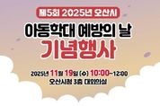 뉴스팍 이소율 기자 | 오산시는 오는 19일 ‘아동학대예방의 날’과 ‘아동학대예방주간’을 맞아 기념행사 및 온·오프라인 캠페인을 실시한다고 12일 밝혔다. 행사는 19일 오전 10시부터 12시까지 오산시청 대회의실에서 진행되며, ▲1부 아동학대예방의 날 기념식 식전공연, 유공자 표창 시상, 퍼포먼스, ▲2부 부모교육 특별강연으로 구성된다. 특별강연은 리플러스 인간연구소 박재연 소장이 ‘부모를 위한 건강한 대화방법’을 주제로 진행한다. 매년 11월 19일은 아동학대 예방과 방지에 대한 사회적 관심을 높이기 위해 제정된 법정기념일로, 오산시는 매년 기념식과 강연, 캠페인 등을 통해 아동학대 예방의 중요성을 알리는 다양한 활동을 추진해오고 있다. 시는 이달 25일까지 온라인 릴레이 캠페인도 함께 진행한다. 오산시민 누구나 SNS에 아동학대예방 메시지 또는 관련 사진을 업로드해 참여할 수 있다. 또한 11월 24일에는 시청 인근 주요 교차로에서 시민 대상 오프라인 홍보 캠페인을 실시해 아동학대 예방 인식 제고에 나설 예정이다. 박현주 아동복지과장은 “이번 행사가 아동학대 예방의 중요성을 되새기고 아이들에