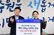 뉴스팍 배상미 기자 | 유치회관이 9월 30일 “취약계층 가정에 전달해 달라”며 수원특례시에 백미 100포를 기부했다. 수원시는 4개 구에 25가구씩, 총 100가구에 백미를 배분할 예정이다. 이날 수원시청에서 열린 전달식에는 유은수 유치회관 대표, 김현수 수원시 제1부시장 등이 참석했다. 유은수 대표는 “추석 명절에 작지만 따뜻한 마음이 이웃들에게 전해지길 바란다”며 “나눔 활동을 지속해서 이어가겠다”고 말했다. 김현수 제1부시장은 “어려움을 겪는 이웃을 위해 꾸준히 나눔 활동을 해 주시는 유치회관에 진심으로 감사드린다”며 “따뜻한 마음을 도움이 필요한 가정에 잘 전달하겠다”고 말했다.