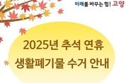 뉴스팍 배상미 기자 | 고양특례시는 다가오는 추석 연휴를 맞아 시민들이 쾌적하고 깨끗한 환경 속에서 명절을 보낼 수 있도록 ‘추석 연휴 생활쓰레기 관리대책’을 수립해 본격 추진한다. 시는 10월 3일부터 9일까지 연휴 기간 동안 상황반과 기동청소반을 운영해 각종 민원과 긴급 상황에 신속 대응하고, 생활쓰레기와 무단 방치쓰레기를 집중 수거할 예정이다. 아울러 연휴 기간 쓰레기 배출일 사전홍보와 쓰레기 상습 투기 우려지역에 대한 집중 단속도 병행한다. 특히, 10월 8일 대체공휴일에도 생활쓰레기 수거를 정상적으로 실시해 시민 불편을 최소화할 방침이다. 다만, 10월 5일, 6일(월·추석), 7일 3일간은 휴무로 인해 수거가 이뤄지지 않는다. 이에 따라 쓰레기 배출은 반드시 수거일 전날 일몰 이후에 해야한다. 시 관계자는 “쾌적하고 깨끗한 명절 분위기 조성을 위해 추석 연휴 기간 생활쓰레기 수거에 만전을 기하겠다”며 “각 가정에서도 음식물 쓰레기 줄이기, 재활용품 분리배출 등 생활쓰레기 감량에 적극 협조해 주시기를 바란다”고 전했다.