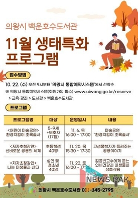 의왕시 백운호수도서관, '11월 생태특화 프로그램'운영