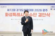 뉴스팍 류은정 기자 | 화성특례시의회는 26일 화성종합경기타운 3층 라운지홀에서 열린 제72회 경기도체육대회 화성시 선수단 결단식에 참석해 선수단을 격려하고 4연패 달성을 위한 결의를 다졌다. 이날 행사에는 배정수 의장을 비롯해 김종복 문화복지위원장, 송선영·이용운 의원, 화성시체육회 임원과 종목단체 관계자, 선수단 등 약 150여 명이 참석했다. 이날 결단식은 경기도체육대회 출전을 앞둔 선수단의 사기를 높이고 각오를 다지는 자리로 마련됐다. 화성특례시 선수단은 오는 4월 16일부터 18일까지 광주시 일원에서 열리는 제72회 경기도체육대회에 출전한다. 육상, 수영, 축구 등 27개 종목에 참가해 종합우승 4연패에 도전한다. 배정수 의장은 “묵묵히 쌓아온 훈련의 시간과 노력을 믿고 끝까지 당당하게 경기에 임해주시기 바란다”며 “선수 여러분의 땀과 투혼이 화성특례시의 자부심”이라고 말했다. 이어 “화성특례시의회도 선수들이 오직 경기에 집중할 수 있도록 체육 환경 조성과 지원에 최선을 다하겠다”며 “4연패 달성을 진심으로 기원한다”고 덧붙였다. 화성특례시의회는 선수들이 충분한