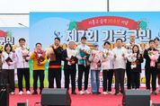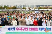 뉴스팍 배상미 기자 | 용인특례시 수지구는 18일 아르피아 상부 체육시설에서 ‘제7회 수지구민 한마음 체육대회’를 개최했다. 수지구 체육연합회가 주최·주관한 이번 대회엔 구민 약 2000여 명이 참여해 승부차기, 볼풀공 바구니농구, 줄다리기, 계주 등으로 구민 모두 한마음으로 어우러지는 시간을 보냈다. 또 식전 공연인 동천동 훌라댄스, 신봉동 밸리댄스와 단국대학교 치어리딩팀 ‘아스테르’의 공연, 퓨전 장구, 보컬그룹 ‘뮤랑’, 마술사 홍승인, 초대 가수 김성환 등이 다채로운 무대를 선보였다. 행사장 곳곳에선 화분 만들기, 친환경 리필스테이션(세제 담아가기), MBTI 검사, 캘리그라피 체험, 키링 만들기, 구민 건강 서비스 안내 부스 등 체험 프로그램이 운영됐다. 이상일 시장은 “우리 수지구민들이 모처럼 한자리에 모여 우정을 나누면서 행사를 통해 행복한 시간을 많이 보내시라고 비가 그친 것 같다”며 “수지중앙공원은 축구장 76개 크기의 시민 힐링 공간으로 조성되고 있고, 상현3동 행정복지센터와 함게 건립되는 광교스포츠센터에는 25m레인 10개의 수영장이 들어서게 된다"며 "서울종합운동장역과 수서역