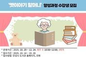 뉴스팍 배상미 기자 | 안성시 중앙도서관은 오는 10월 29일부터 12월 24일까지 매주 수요일 오전 10시부터 12시까지(총9회) 진행되는 『옛이야기 할머니』양성과정의 수강생을 모집한다. 이번 과정은 우리 전통 설화와 구전문화를 이해하고, 이를 바탕으로 어린이들에게 옛이야기를 들려줄 수 있는 이야기 구연 역량을 키우는 특화 교육 프로그램으로 교육은 송경애 강사(한국국학진흥원 및 아름다운 이야기 할머니 교육강사)가 진행하며, 이야기 전달 기법, 발성 훈련, 스토리텔링 실습 등 실질적인 교육 중심으로 구성된다. 참여 대상은 60세 이상 여성 20명으로, 접수는 10월 14일부터 도서관 홈페이지, 전화 또는 방문을 통해 신청할 수 있다. 도서관 관계자는 “지역 어르신들이 삶의 지혜와 전통 이야기를 전하며 세대 간 소통의 다리를 놓는 뜻깊은 과정이 될 것이고 본 과정을 수료한 참여자들은 2026년 ‘책 읽어주기’ 자원봉사 프로그램에 참여할 수 있도록 안내할 계획이다.”라고 전했다.
