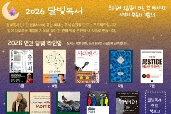 뉴스팍 배상미 기자 | 경기도교육청평생학습관(관장 류영신)이 청소년과 성인이 함께 참여하는 독서 프로그램 ‘달빛독서’를 운영한다. 3월부터 12월까지 운영되는 ‘달빛독서’는 매월 한 권의 주제 도서를 선정해 한 달간 읽고 온라인을 통해 독서 경험과 생각을 나누는 프로그램으로 개인 중심의 독서를 넘어 소통하는 독서 문화를 확산하기 위해 마련됐다. 프로그램은 온라인 독서 인증과 의견 나눔을 중심으로 운영되며, 주제 도서와 연계한 온라인 독서 강의를 통해 책에 대한 이해를 넓히고 다양한 관점을 공유할 수 있도록 구성됐다. 월별 주제 도서는 ▲3월-총균쇠(재레드 다이아몬드) ▲4월-열두 발자국(정재승) ▲5월-사피엔스(유발 하라리) ▲6월-신곡(단테 알리기에리) ▲7월-정의란무엇인가(마이클 샌델) ▲8월-논어(공자), Tuesdays with Morrie(Mitch Albom) ▲9월-모비딕(허먼 멜빌) ▲10월-1984(조지 오웰) ▲11월-특이점이 온다(레이 커즈와일) 등으로 구성됐으며 12월에는 연말 북토크가 예정되어 있다. 참여자 모집은 주제 도서별로 진행되며 전월 20일부터 경기도교육청평생학습관 누리집을