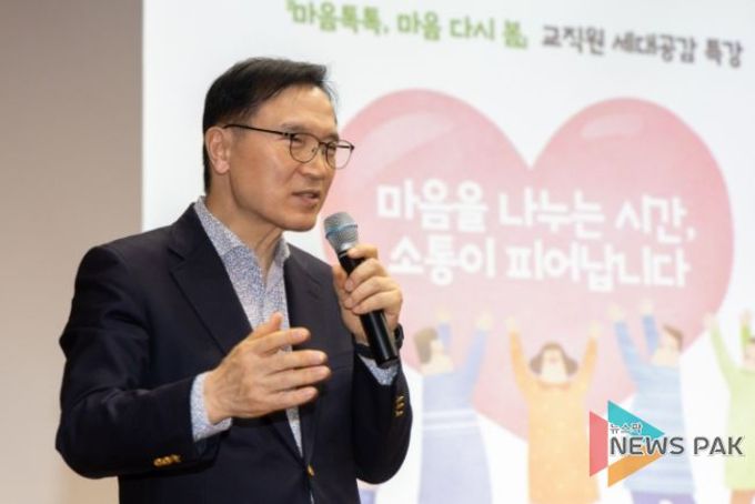 뉴스팍 배상미 기자 | 경기도교육청교직원복지센터가 31일 교직원의 세대 간 이해와 조직 내 건강한 소통 문화 조성을 위해 ‘마음톡톡, 마음 다시 봄’교직원 세대공감 특강을 운영했다. 경기도교육청교직원복지센터 대강당에서 진행된 이번 특강에는 임태희 경기도교육감을 비롯해 경기도교육청 소속 교직원 300여 명이 참석한 가운데 진행됐으며 ‘90년생이 온다’의 저자 임홍택 작가가 강연자로 참여했다. 임태희 교육감은 이날 격려사를 통해 “교육 분야에 종사하시는 선생님이든 행정직이든 또 급식실에서 일하시는 실무사님이든 상당 기간 동안은 그 감정을 감추고 숨기고 일을 해야하기에 마음이 힘들고 몸에 병이 될 수 있다”며 “교직원복지센터라는 시스템을 통해 내 신체 건강과 마음 건강을 지켜나갈 수 있도록 해야한다”고 말했다. 특강에서 임 작가는 ‘세대와 조직을 잇는 소통 이야기’를 주제로 세대 간 인식 차이와 소통 방법을 쉽고 흥미롭게 전달했다.
