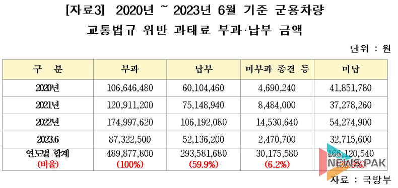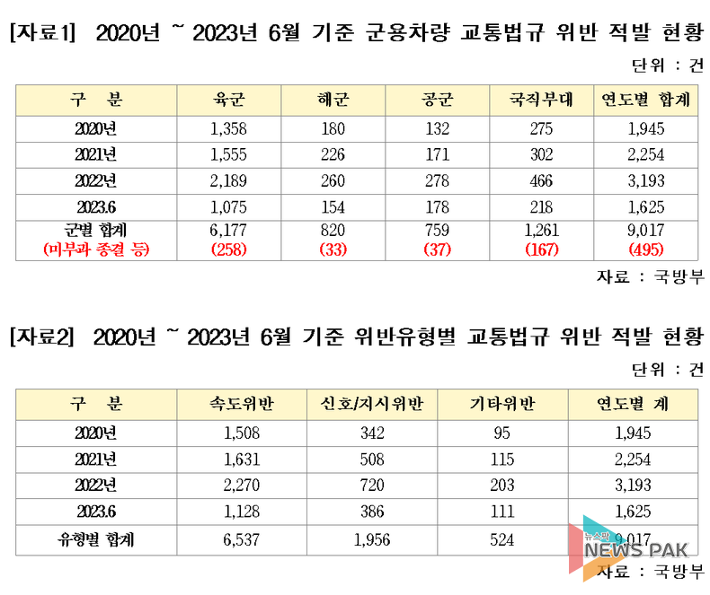 뉴스팍 배상미 기자 | 최근 도로 위에서 우리 국민의 안전에 위협이 될 수 있는 군용차량 교통법규 위반사례가 큰 폭으로 증가해 군이 군용차량의 교통질서 준수율을 높이기 위한 근본적인 대책 마련에 나설 필요가 있다는 지적이 제기됐다.