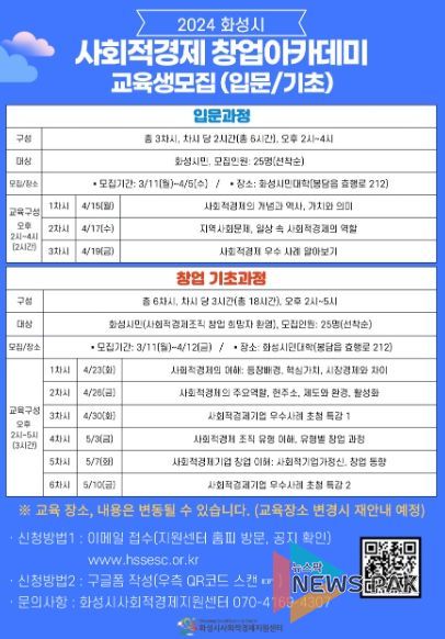 뉴스팍 류은정 기자 | 화성시가 사회적경제·가치에 대한 인식 확산과 사회적기업 예비 창업자 발굴을 위한 2024년 상반기 화성시 사회적경제 창업아카데미 입문·기초과정 수강생을 모집한다.