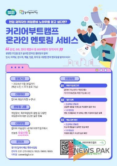 뉴스팍 배상미 기자 | 경기도일자리재단이 구직자들 대상으로 커리어 부트캠프 온라인 멘토링 서비스를 운영한다고 3일 밝혔다.