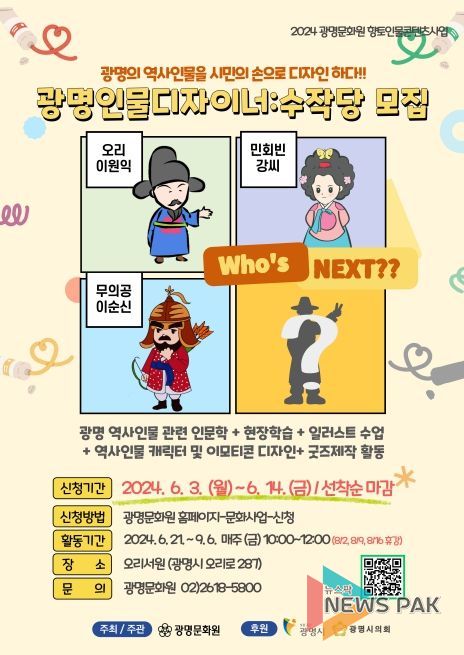 역사 인물을 연구하고 일러스트 수업을 통해 캐릭터를 완성해 가는 작업에 참여하고 싶은 광명시민은 누구나 6월 3일부터 광명문화원 홈페이지를 통해 참여를 신청할 수 있다.