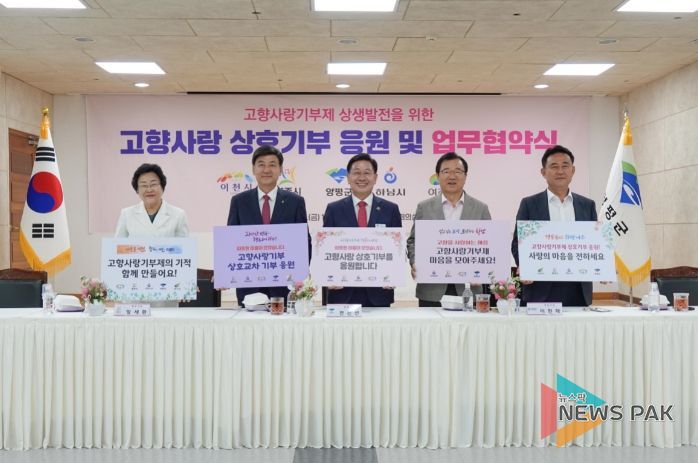 뉴스팍 류은정 기자 | 양평군(군수 전진선)이 7일 별관 4층 대회의실에서 광주시(시장 방세환), 하남시(시장 이현재), 이천시(시장 김경희), 여주시(시장 이충우)와 ‘고향사랑기부제 상생발전을 위한 업무협약’을 맺었다.