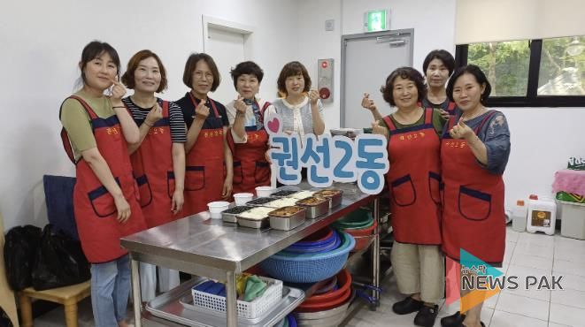 이날 권선2동 통장협의회 회원 10여 명은 무더운 날씨에도 입맛을 돋우는 다양한 식재료를 사용하여 손수 반찬을 만들었다. 이날 완성된 반찬은 독거노인, 장애인가구 등 취약계층 15세대에 직접 방문하여 전달했다.
