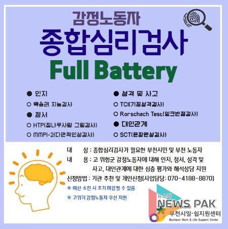 뉴스팍 류은정 기자 | 부천시여성청소년재단이 운영하는 부천시일쉼지원센터는 부천시 거주 또는 부천시 사업장 재직 중인 감정노동자에게 종합심리검사를 지원한다.