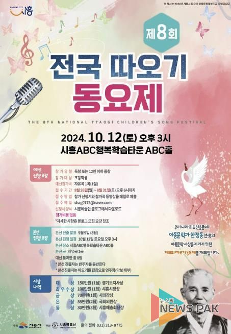 뉴스팍 류은정 기자 | 시흥시가 오는 8월 26일부터 8월 31일까지 ‘2024년 제8회 전국 따오기 동요제’를 빛내 줄 전국의 실력 있는 독창자, 중창팀을 모집한다.