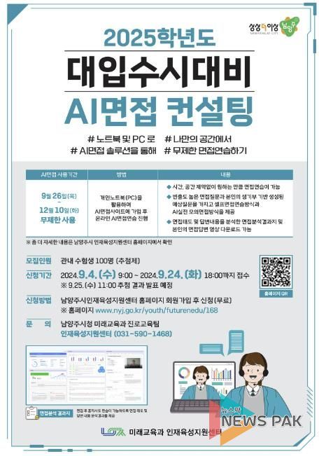뉴스팍 류은정 기자 | 남양주시는 관내 수험생을 대상으로 ‘2025학년도 대입수시대비 AI면접 컨설팅’ 프로그램의 참여자 100명을 오는 4일부터 24일까지 모집한다고 밝혔다.