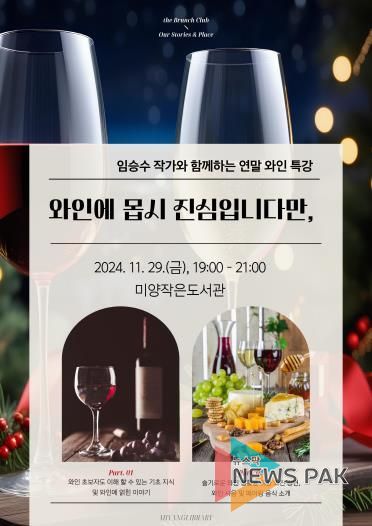 뉴스팍 이소율 기자 | 안성시 미양작은도서관은 오는 11월 29일 금요일 오후 7시, 임승수 작가와 함께하는 연말 와인 특강 '와인에 몹시 진심입니다만,'을 진행한다.