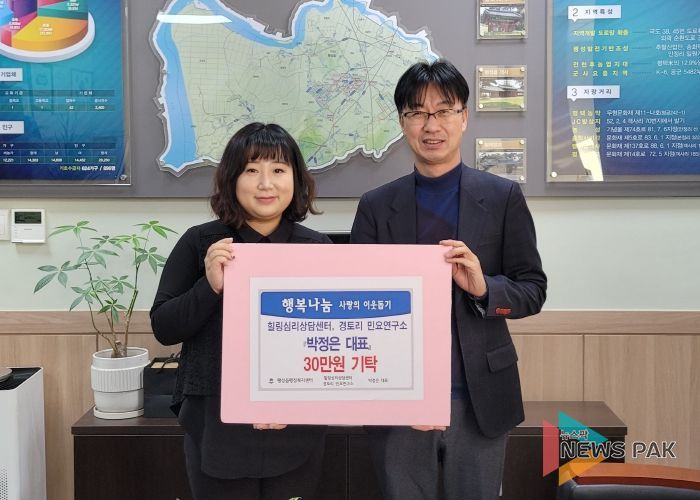 뉴스팍 이소율 기자 | 힐링심리상담센터 및 경토리 민요연구소의 박정은 대표는 지난 16일 평택시 팽성읍 행정복지센터를 방문해 30만 원을 저소득 가구 지원을 위한 기부금으로 전달했다.