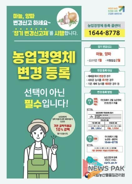뉴스팍 이소율 기자 | 국립농산물품질관리원 안성사무소은 1월 2일부터 31일까지 양파·마늘을 경작하는 농업경영체를 대상으로 등록정보에 대한 ‘정기 변경신고 기간’을 운영한다고 밝혔다.