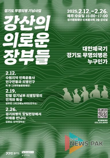 뉴스팍 배상미 기자 | 경기문화재단 경기역사문화유산원은 〈강산의 의로운 장부들: 대한제국기 경기도 무명의병은 누구인가〉라는 주제로 〈경기도 무명의병 기념사업 역사문화강좌〉를 진행한다.