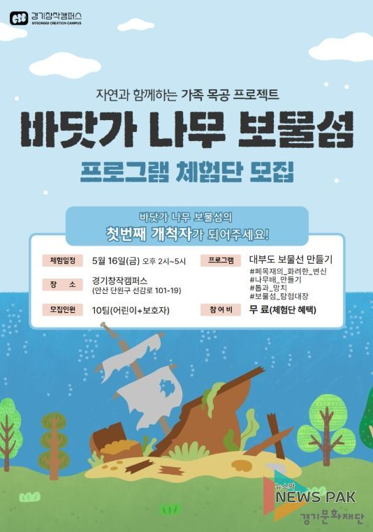 뉴스팍 배상미 기자 | (재)경기문화재단(대표 유정주) 지역문화본부 경기창작캠퍼스는 다가오는 5월 16일부터 ‘어린이 목공 체험 교육 '바닷가 나무 보물섬'’을 운영한다. 경기창작캠퍼스(안산시 단원구 선감로 101-19)에서 총 20회차에 걸쳐 진행되는 이번 프로그램은 각 회차의 어린이와 가족 참여자들이 폐목재를 활용하여 ‘보물섬’을 만들어간다는 내용을 담고 있다.