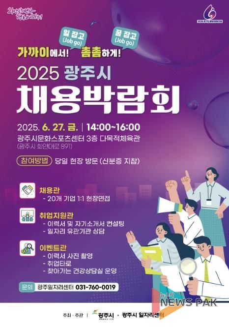 뉴스팍 이화형 기자 | 광주시는 오는 27일 오후 2시부터 4시까지 광주시문화스포츠센터 3층 다목적체육관에서 ‘2025년 광주시 채용박람회’를 개최한다고 12일 밝혔다.