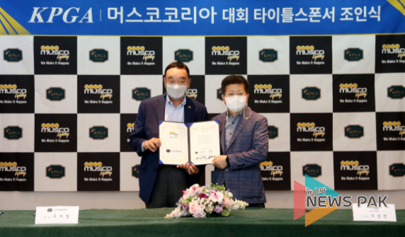 뉴스팍 배상미 기자 | (사)한국프로골프협회(회장 구자철,KPGA)와 머스코코리아 유한회사(대표 제프리에이로저스 이하 머스코코리아) 가 1일 경기 성남 소재 KPGA 빌딩에서 KPGA 챔피언스투어 ‘머스코 문라이트 KPGA 시니어 오픈’ 개최 조인식을 가졌다.