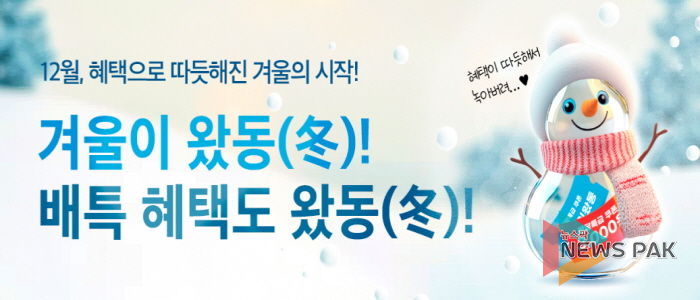 뉴스팍 배상미 기자 | 경기도와 경기도주식회사가 공동 운영하는 경기도 공공배달앱 배달특급이 겨울을 맞아 12월 한 달간 ‘겨울이왔동(冬)’ 소비자 할인 프로모션을 진행한다.