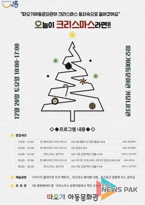 뉴스팍 배상미 기자 | 시흥시 따오기아동문화관이 오는 12월 20일 크리스마스 문화행사 ‘오늘이 크리스마스라면’을 연다. 반짝이는 트리, 서늘한 겨울 공기, 책장을 넘기는 소리가 한데 어우러지며 문화관은 잠시 ‘이야기가 살아 움직이는 공간’으로 변한다.
