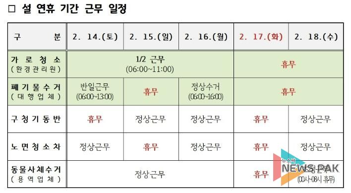 이와 함께 연휴 기간 중 생활폐기물 수거 일정을 공동주택 게시판, 안내방송, 홈페이지 등을 통해 알리고, 음식물 쓰레기 감량과 올바른 분리배출방법도 적극 홍보 예정이다.