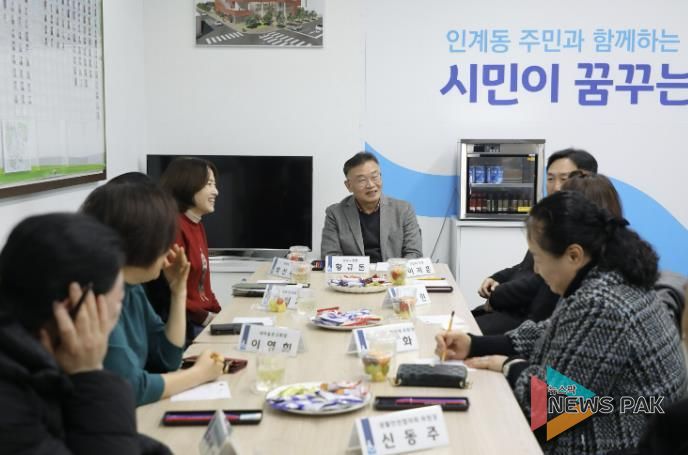 2일 첫 방문지로 인계동과 매교동을 찾은 황규돈 구청장은 유관 단체장 및 주민들과 만나 ▲인계동 신청사 개청에 따른 지원 건의 ▲장마철 대비 수원천 주변 도로 등 환경 개선 요청 ▲보도블록 정비 ▲매교동 신청사 설계시 주민의견 반영 요청 등 주민 안전과 생활 편의 개선에 대한 지역의 애로사항을 경청했다.
