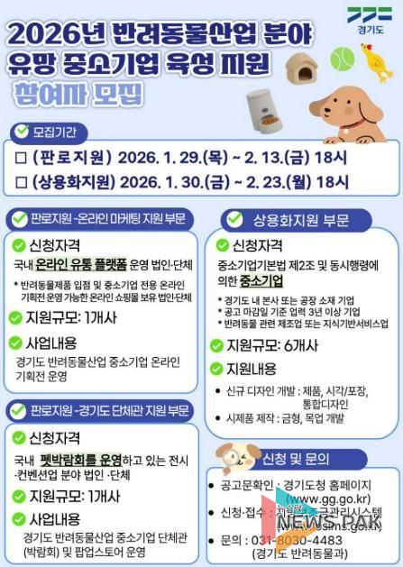 뉴스팍 배상미 기자 | 경기도가 ‘반려동물산업 분야 유망 중소기업 육성 지원사업’ 참여 보조사업자를 모집한다.