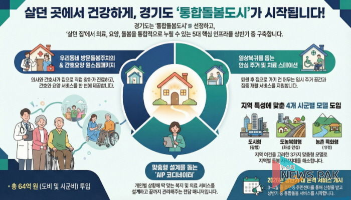뉴스팍 배상미 기자 | 경기도가 화성시, 광명시, 안성시, 양평군 등 4개 시군을 ‘통합돌봄도시’로 선정해 의료-요양-주거 연계 5대 인프라를 상반기 중으로 구축한다.