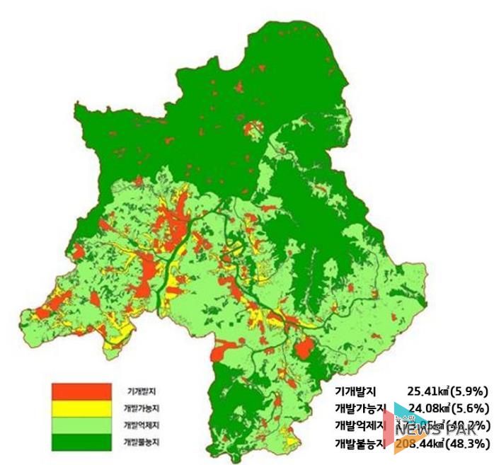 광주시는 시 전역이 특별대책지역과 자연보전권역으로 지정돼 있으며 개발제한구역·상수원보호구역·수변구역·군사시설보호구역 등 각종 중첩 규제를 받고 있다. 전체 면적의 65%가 임야로 구성돼 개발 가용지가 부족한 상황이다. 이에 따라 시는 개발 가용지에 대한 체계적 관리와 양질의 개발 유도를 위한 합리적인 도시관리계획 수립이 필요하다고 설명했다.