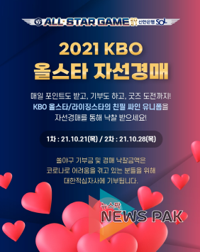 뉴스팍 배상미 기자 | KBO(총재 정지택)와 KBO 리그 타이틀 스폰서인 신한은행(은행장 진옥동)은 야구팬들의 성원에 보답하고 어려운 이웃을 돕기 위해 ‘2021 KBO 올스타 자선경매 in 쏠야구’ 이벤트를 공동으로 시행한다.