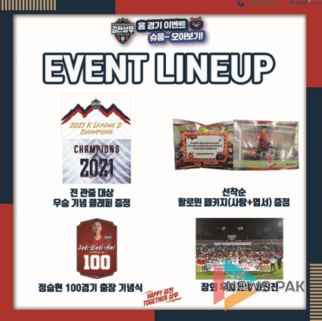 뉴스팍 이소율 기자 | 김천상무프로축구단이 31일 오후 3시 김천종합운동장에서 ‘하나원큐 K리그2 2021’ 36R 부산아이파크와 홈경기를 치른다. 올 시즌 마지막 홈경기 부산전에서도 김천은 팬들을 위한 다양한 이벤트를 진행할 예정이다.